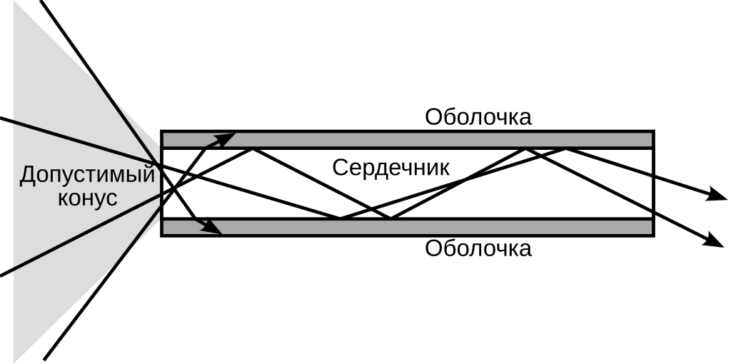 • Оптическое волокно, как правило, имеет круглое сечение и состоит из двух частей — сердцевины и оболочки (иногда многослойной, например, двойной). Для обеспечения полного внутреннего отражения абсолютный показатель преломления сердцевины несколько выше показателя преломления оболочки. Сердцевина изготавливается из чистого материала (стекла или пластика) и имеет диаметр 9 мкм (для одномодового волокна), 50 или 62,5 мкм (для многомодового волокна). Оболочка имеет диаметр 125 мкм и состоит из материала с легирующими добавками, изменяющими показатель преломления. Например, если показатель преломления оболочки равен 1,474, то показатель преломления сердцевины — 1,479. Луч света, направленный в сердцевину, будет распространяться по ней, многократно отражаясь от оболочки.