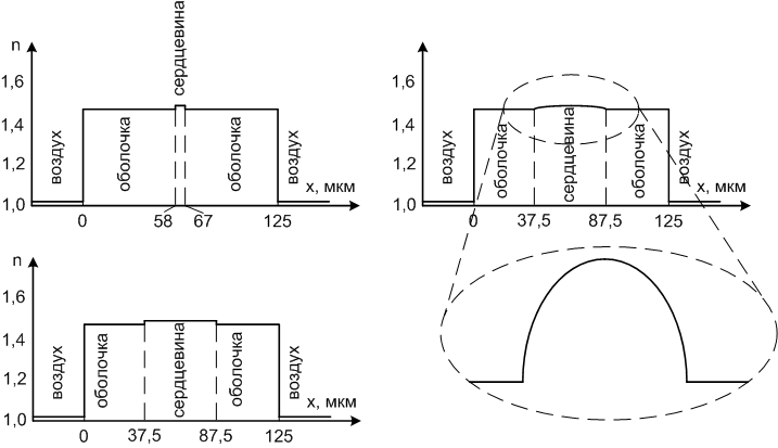 Многомодовые волокна подразделяются на ступенчатые и градиентные. В ступенчатых волокнах показатель преломления от оболочки к сердцевине изменяется скачкообразно. В градиентных волокнах это изменение происходит иначе — показатель преломления сердцевины плавно возрастает от края к центру. Это приводит к явлению рефракции в сердцевине, благодаря чему снижается влияние дисперсии на искажение оптического импульса. Профиль показателя преломления градиентного волокна может быть параболическимтреугольным, ломаным и так далее.